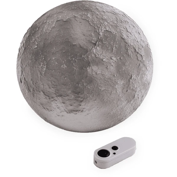 - Siéntese cómodamente en la habitación de su hijo, desembale el mando a distancia incluido y controle las fases lunares de la lámpara de forma manual o deje que cambien automáticamente