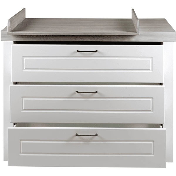 El cambiador con elegantes asas de color plateado Metal y sin tornillos visibles es una de nuestras versiones más amplias. Con otros muebles infantiles de la serie «Felicia», puedes crear una habitación infantil o de bebé completa y con estilo. El cambiador se ha desarrollado en Alemania y cumple las normas de seguridad vigentes según la norma EN 12221 – 1+2:2008 + A1:2013. El cambiador «Felicia» se ha fabricado en la UE y es fácil de montar.