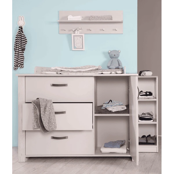 El cambiador roba con tapa cambiadora es un verdadero todoterreno y le servirá durante muchos años. El robusto cambiador puede utilizarse como asiento elevado para su hijo de guardería, para que pueda ayudarle fácilmente a vestirse en una cómoda posición de pie. Más adelante, el cambiador puede utilizarse como cómoda en el salón o en la habitación del niño. El cambiador con asas de aspecto de cuero y sin tornillos visibles en modern es una de nuestras versiones más amplias. Con otros muebles infantiles de la serie «Mila», puede crear una elegante habitación infantil o de bebé. El cambiador se ha desarrollado en Alemania y cumple las normas de seguridad vigentes según la norma EN 12221 – 1+2:2008 + A1:2013. El cambiador «Mila» es fácil de montar.