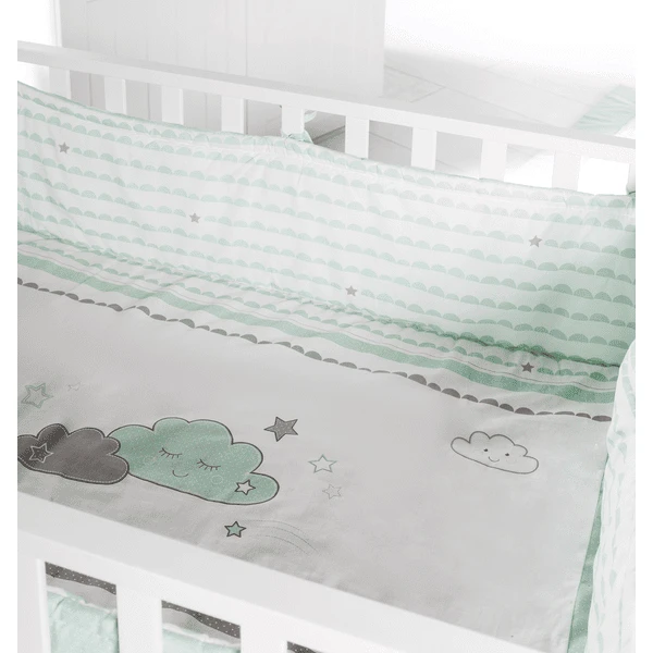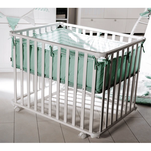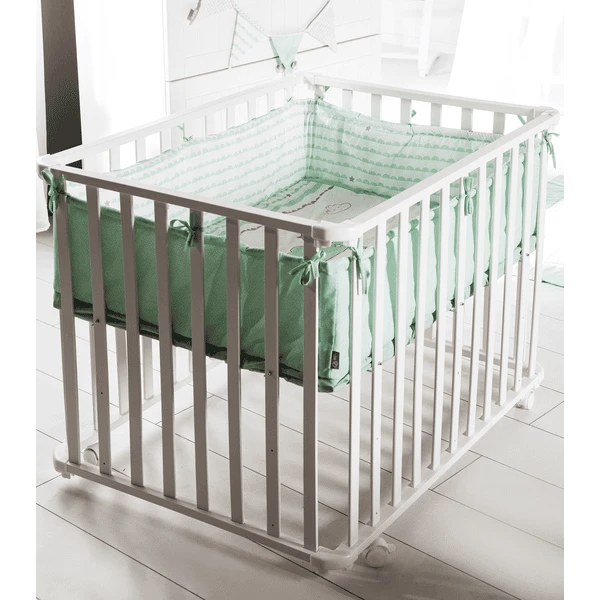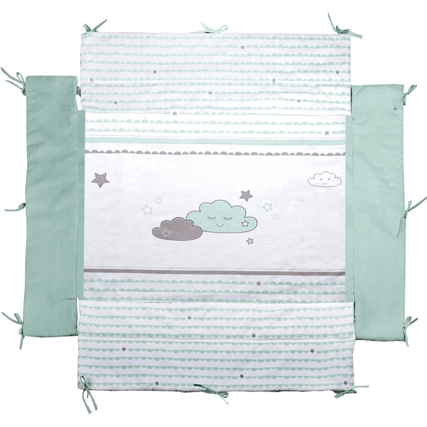 35% algodón, 65% poliéster Relleno: 100% poliésterAdecuado para corralitos de dimensiones entre 75 x 100 cm y 100 x 100 cm Correas laterales de sujeciónDetalles del cuidado: fácil de limpiar con un paño húmedo lavable hasta 30°C apto para secadora