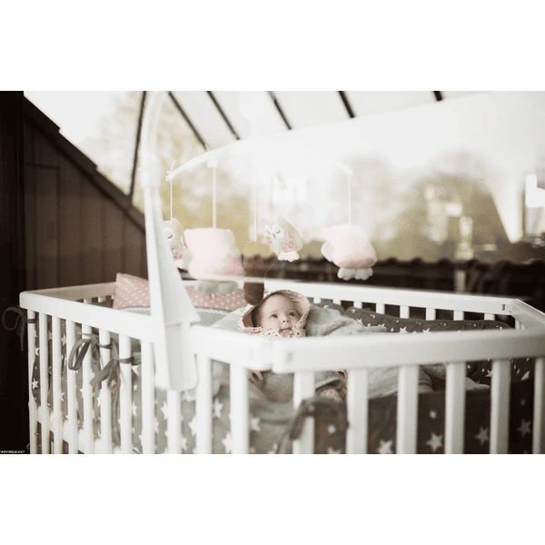 La adorable incrustación de algodón natural está rellena de poliéster y se fija a las barras con pequeñas cintas.